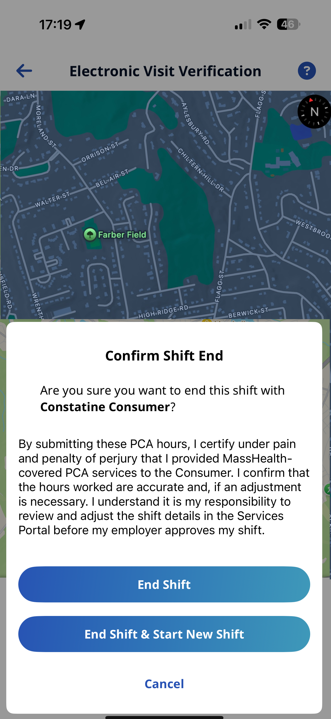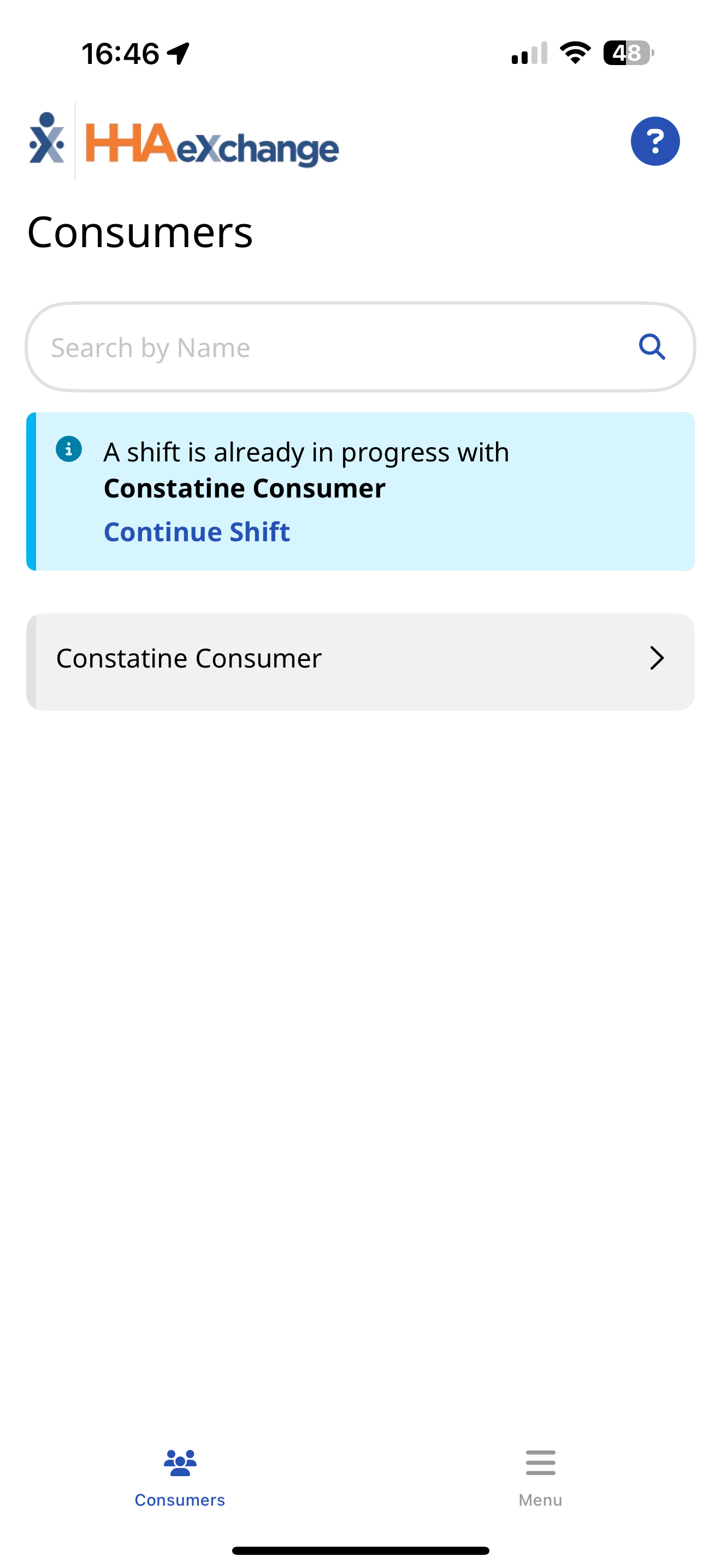 You can now navigate away from the app, or close it. To continue or end the shift, from the Consumers page, tap Continue Shift.
