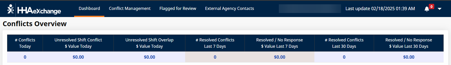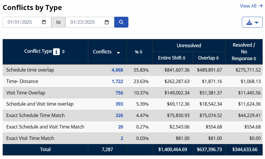 | Unresolved Impact | Estimated monetary value of conflicts that are not yet resolved. It consists of a Shift calculation which takes into account the billable value of the entire duration of the visit and an Overlap calculation which only estimates the financial impact based on the amount of time the two visits overlap. |