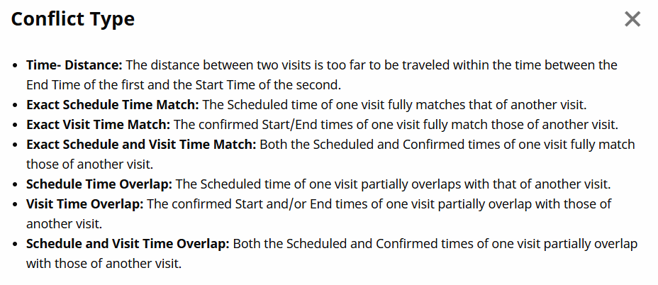 | Conflict | A set of visits that overlap, either partially or entirely. |