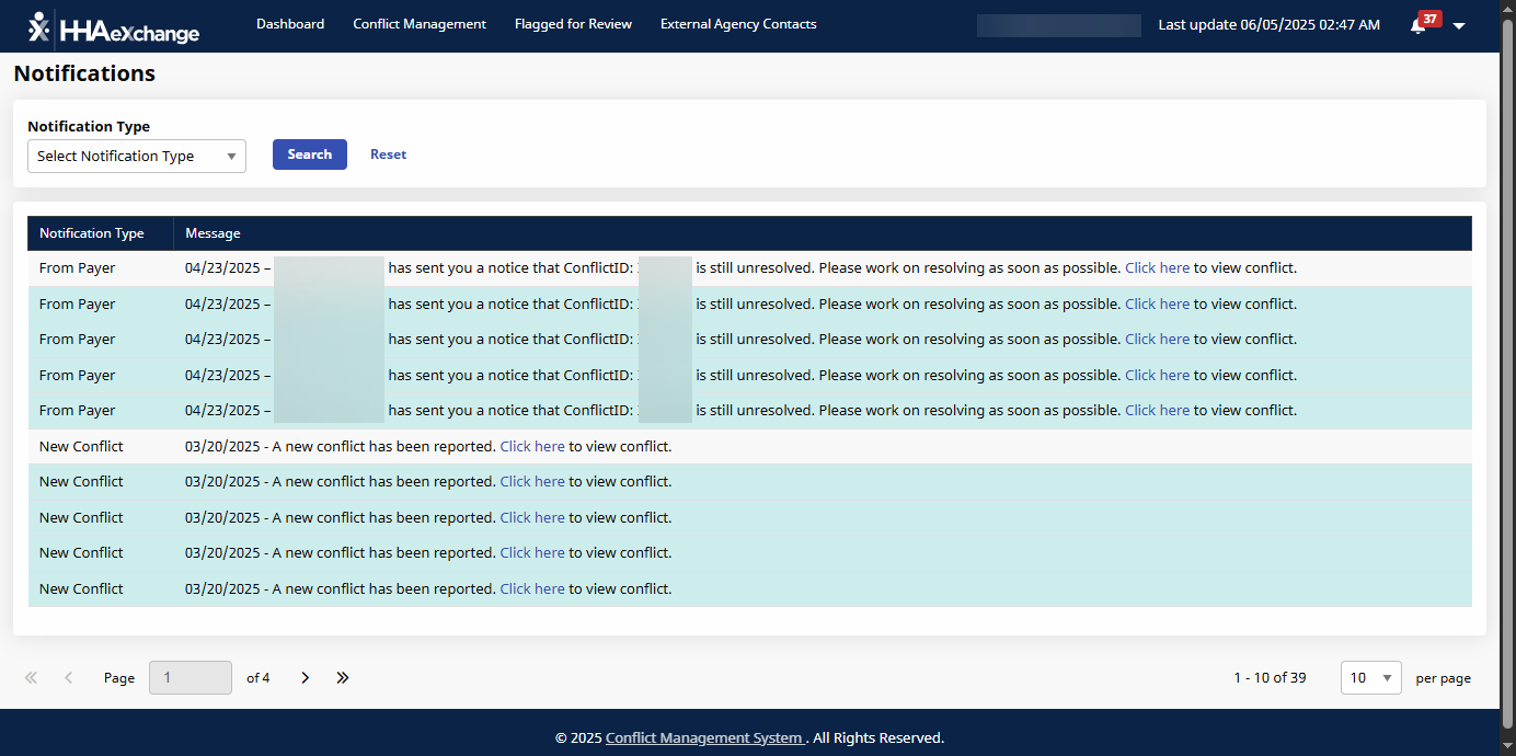 The Notifications feature under the Bell icon displays all Conflict Management notifications.