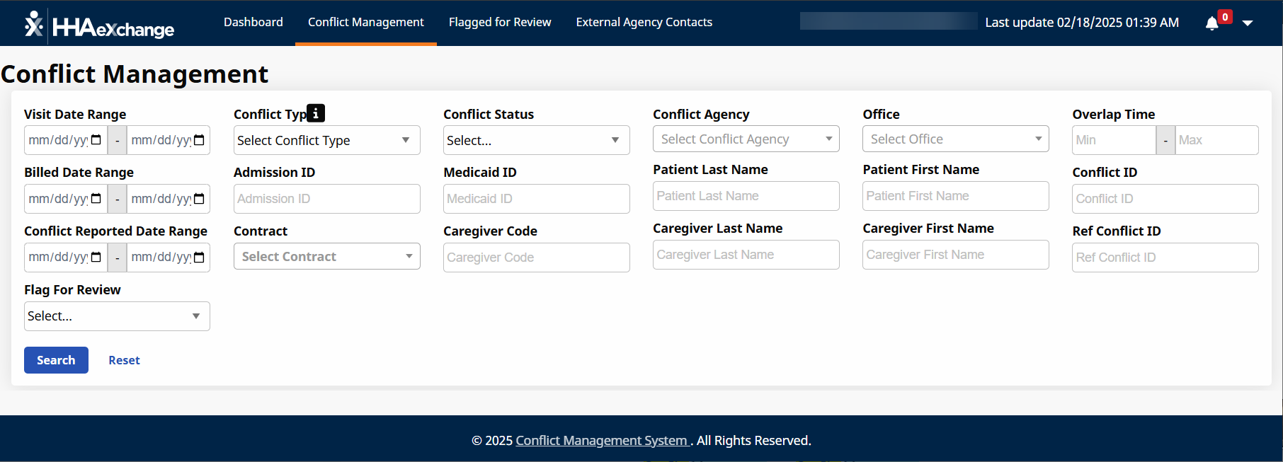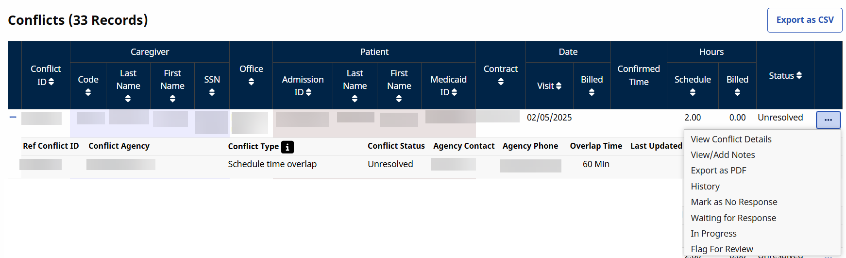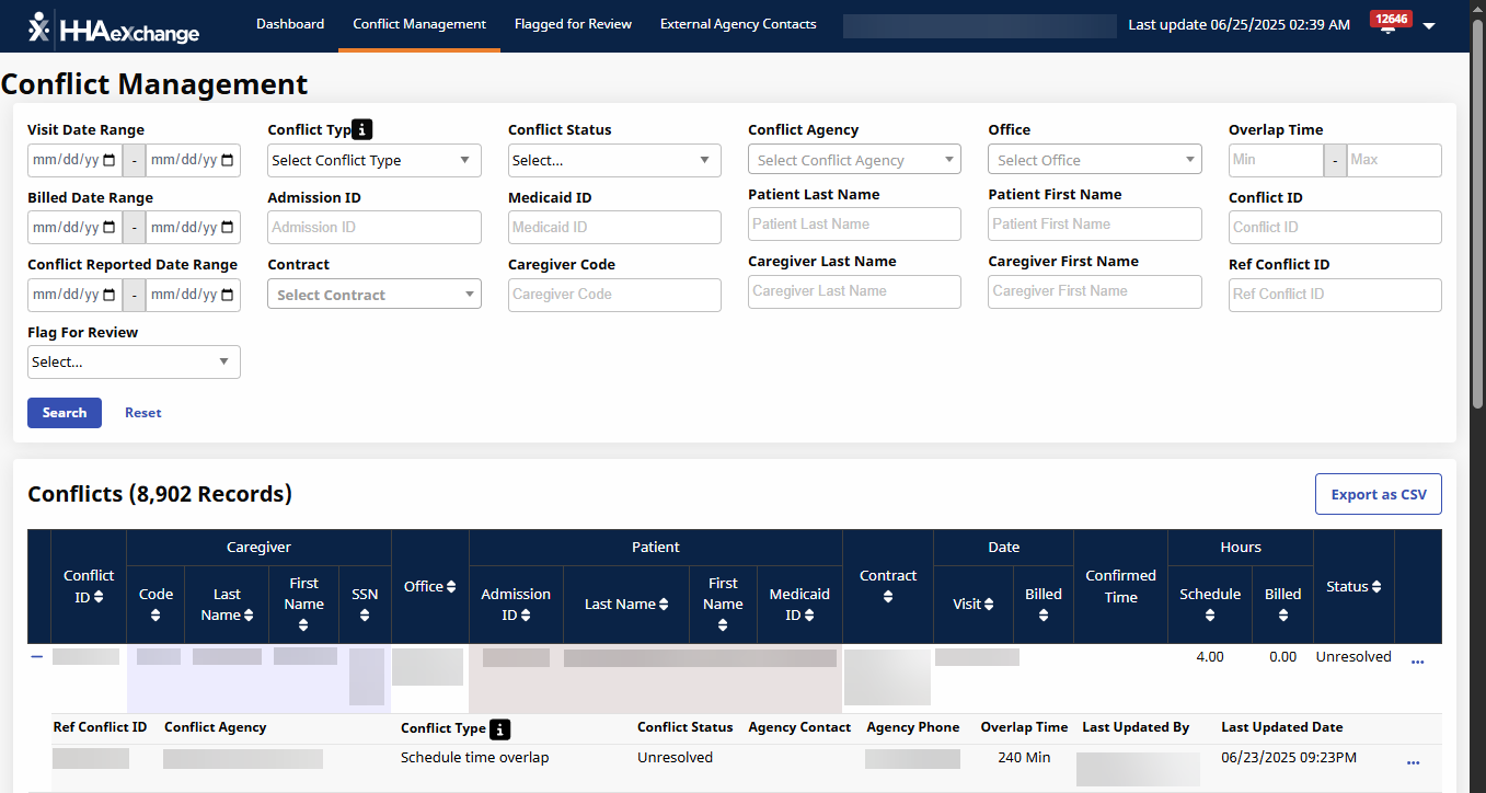The Conflict Management page under Action > Conflict Management Dashboard helps providers quickly identify and resolve conflicts on overlapping caregiver visits. This powerful tool: