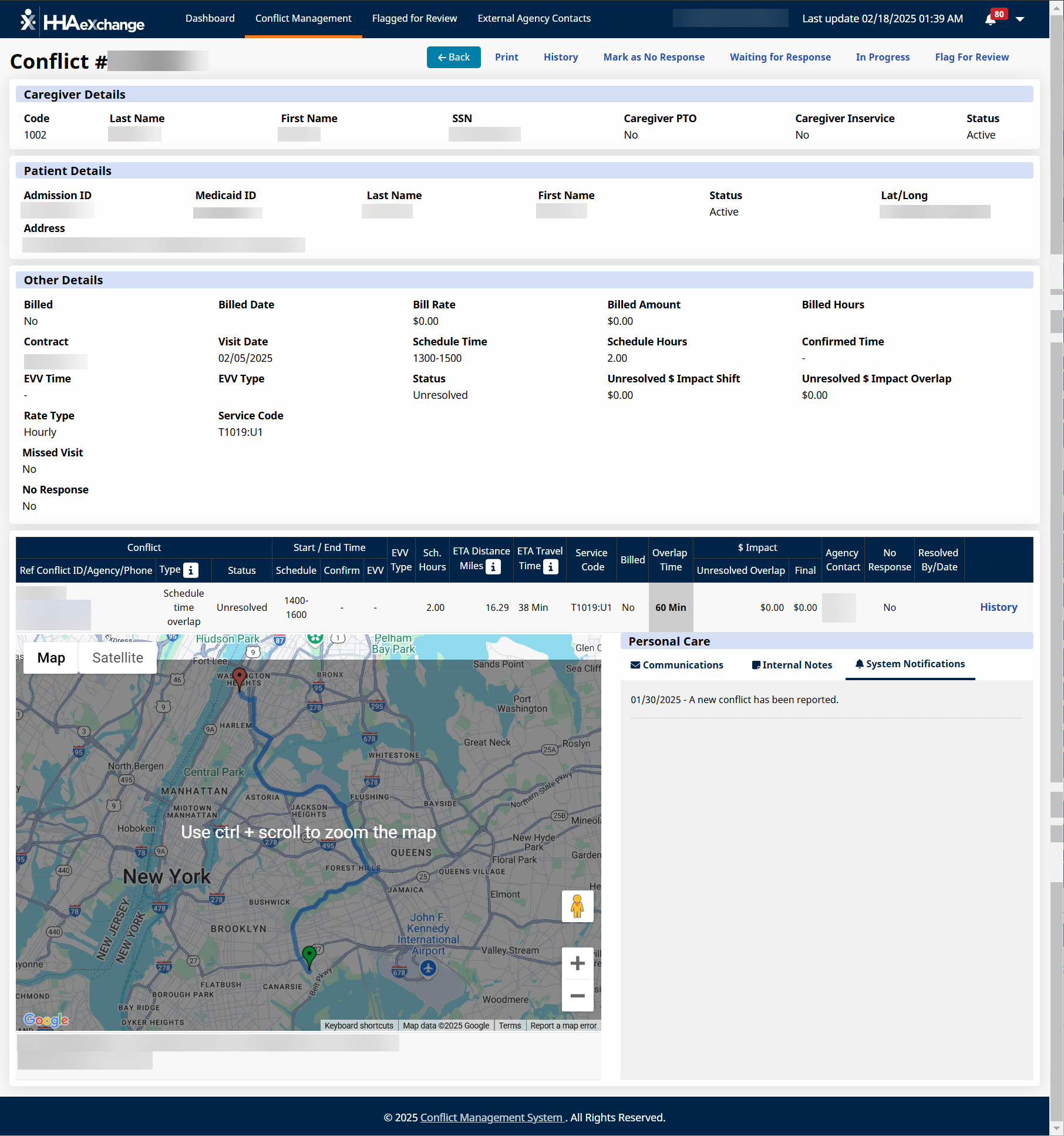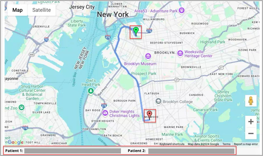 The map flags the location of the 2 patients involved in the conflicting visits under the Action > Conflict Management Dashboard > Confict Management > Conflict Detail, one in green and the other one in red. The address of both patients is listed at the bottom. Patient 1 refers to your agency’s patient, while Patient 2 refers to the patient on the conflicting agency side.