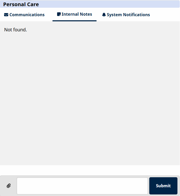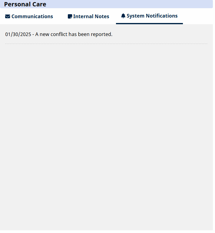 Click the Internal Notes tab under Action > Conflict Management Dashboard > Confict Management > Conflict Detail > Personal Care section to add additional information regarding the conflict. Internal notes are not shared with the payer or conflicting provider. Use this feature to document the steps you are taking to investigate and resolve the conflict.