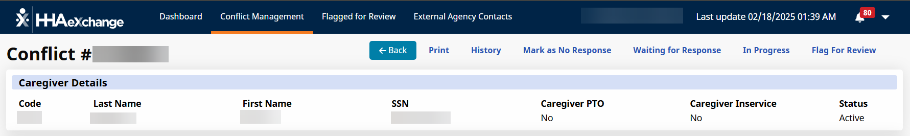 Use Communications under Action > Conflict Management Dashboard > Confict Management > Conflict Detail > Personal Care section to send and receive messages from/to the conflicting Provider or Payers associated with the patients on the conflicting visits.