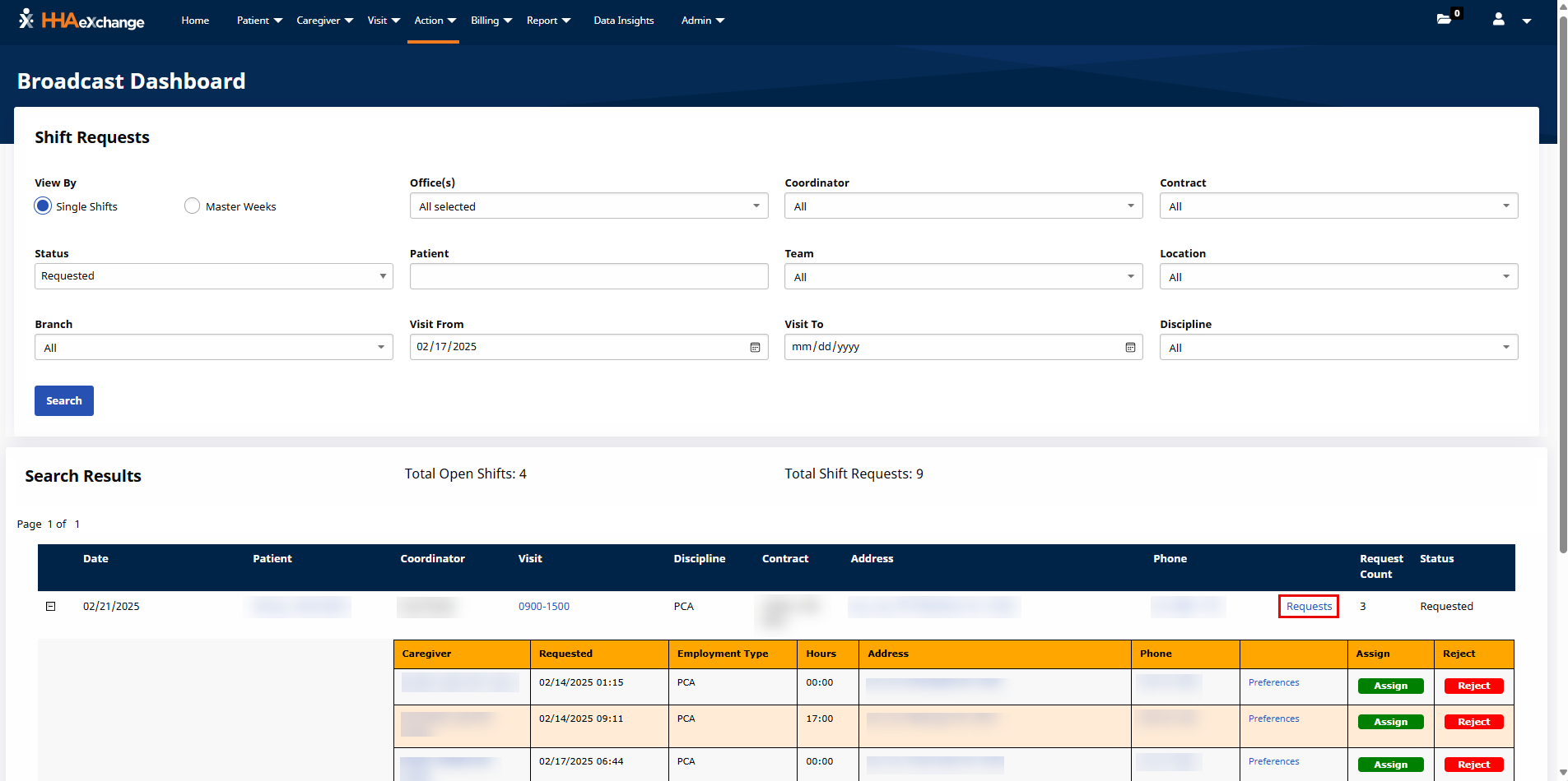 The Broadcast Dashboard feature under Action > Broadcast Dashboard is where a Coordinator reconciles all existing requests to fill shifts, sorted by visit. This feature loads information based on a set of search filters, such as the Visit Search page. An image of the dashboard is pictured below.