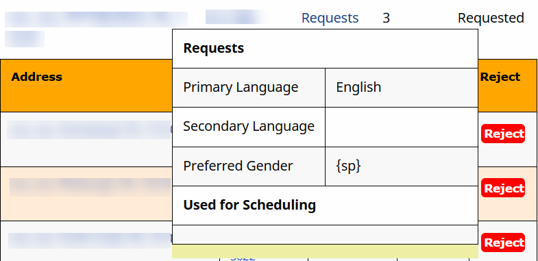 Hover over the Requests link to access Patient Preferences to include Primary and Secondary Language, Preferred Gender, and other preferences. Click the link to access the Caregiver’s Preferences. |