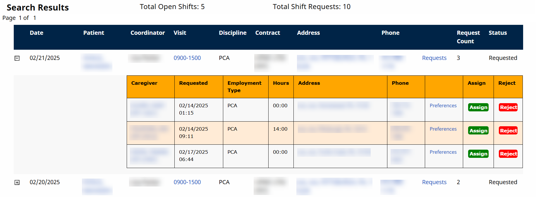 Assign a Request – Assign a shift to a Caregiver and all other requests for the shift are rejected; OR