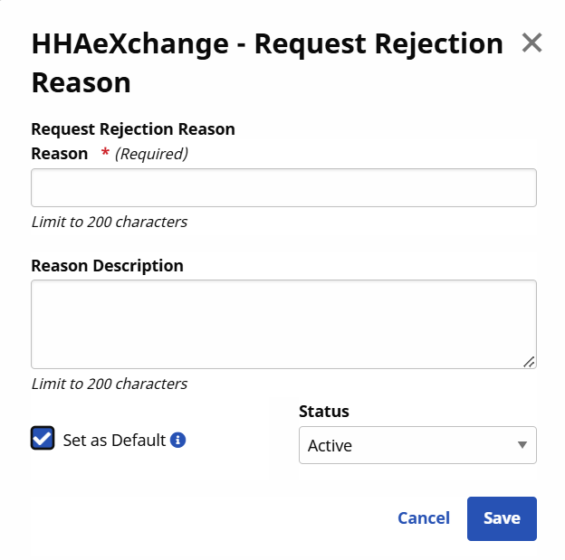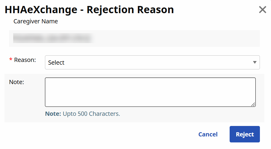 , the selected row is removed, and the Rejection Reason window opens. If all rows are rejected, then the Caregiver Requests grid is removed and the Status switches to No Requests.