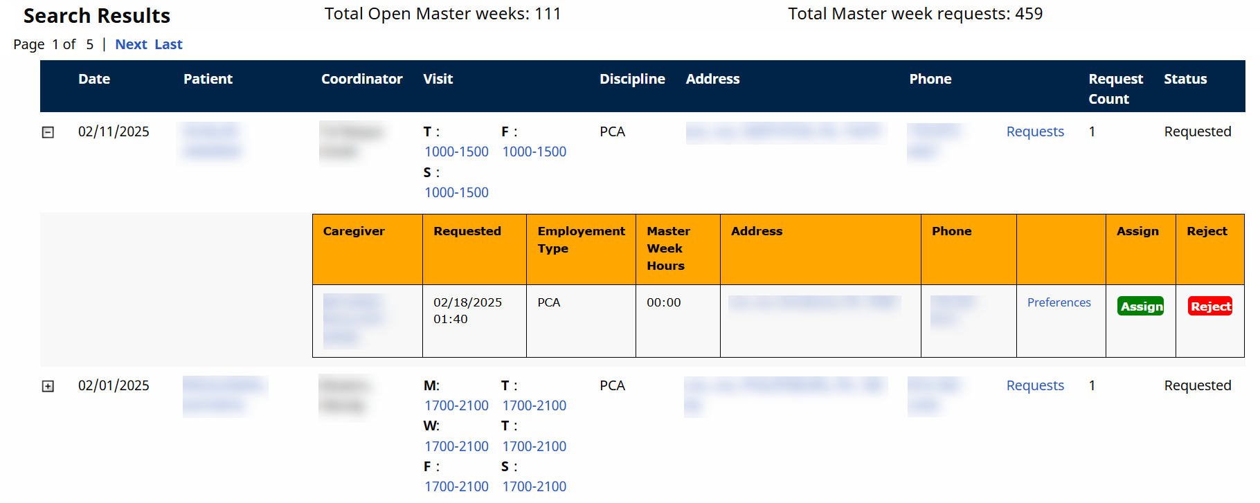 Caregivers who have made a Master Week request are listed underneath the Open Master Week, as illustrated in the image below. Click the + / - box to expand/collapse the details. Refer to the Caregiver Single Shifts View table for the descriptions to each line item.