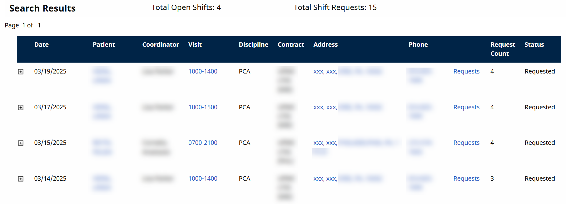 The total number of open shifts and the total number of shift requests are provided and summarized above the results grid. Each result includes information as described in the following table (one row, per Patient, per open shift).
