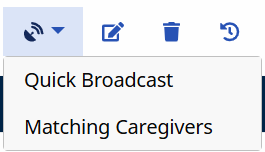 Broadcast buttons are available in various locations allowing users to complete a Quick Broadcast (sent to all Caregivers) or Matching Caregivers broadcast (sent to select/applicable Caregivers).