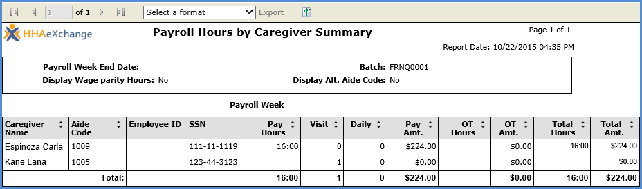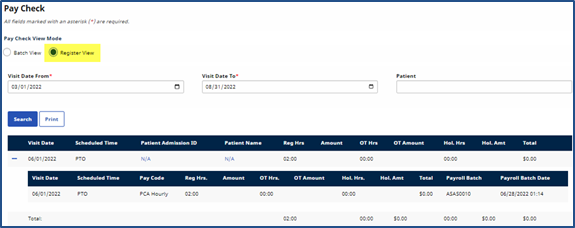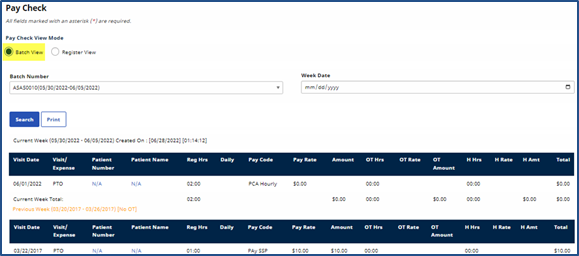 The Pay Check page under Caregiver Profile > Pay Check provides an overview of a Caregiver’s paychecks. The summary can be opened in a Batch View or a Register View.