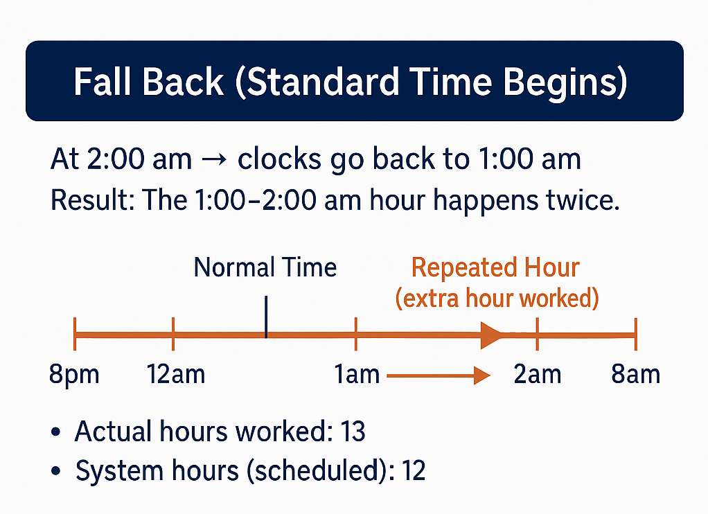 What happens: At 2:00 am, clocks move back to 1:00 am. The hour between 1:00–2:00 am repeats, so shifts include one extra hour.