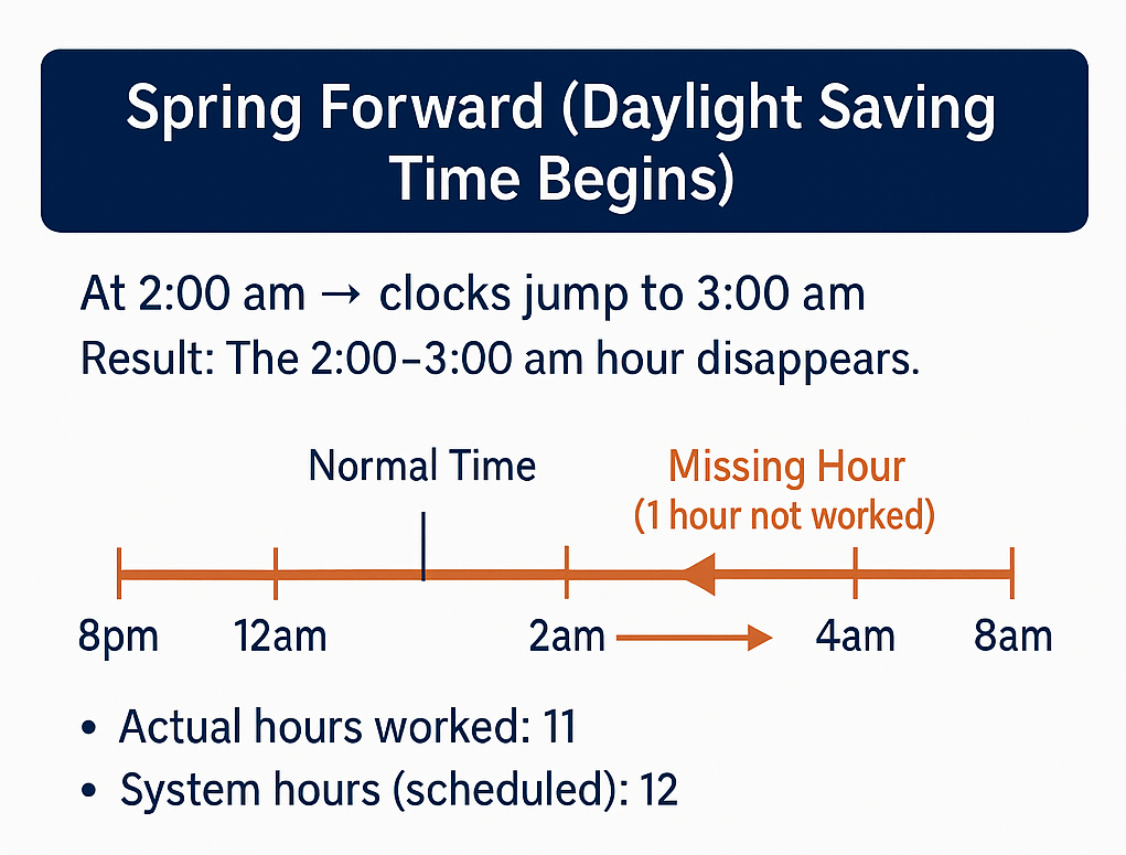 What happens: At 2:00 am, clocks jump forward to 3:00 am. The hour between 2:00–3:00 am is skipped, so shifts lose one hour.