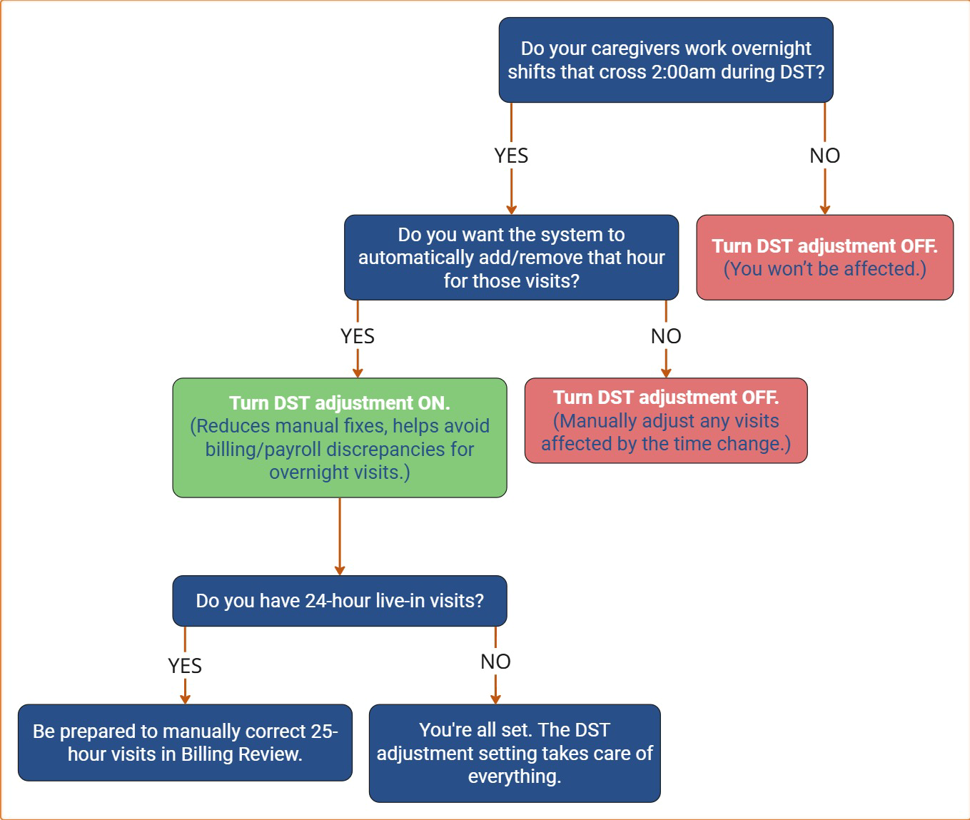 Refer to the flowchart below to determine whether the DST adjustment setting is right for your agency: