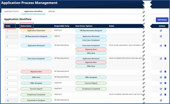 The Order column indicates the numerical sequence of actions to take place based on the Status label, such as Application Submitted representing the first action.