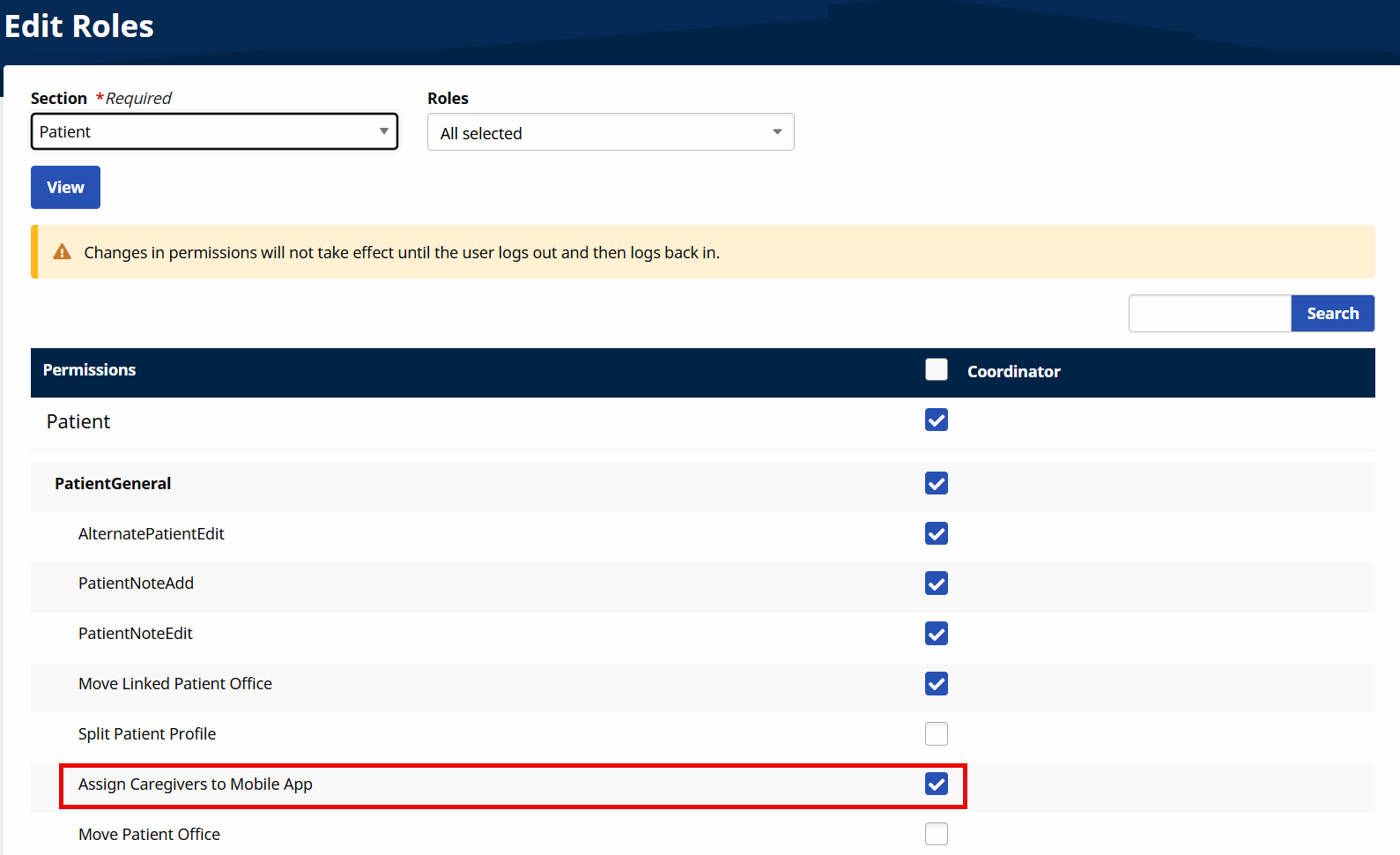 To disable permissions for a role, go to the Edit Roles page and select Patient from the Section dropdown, and the role(s) from the Roles field. Deselect the applicable checkboxes for the corresponding role(s).