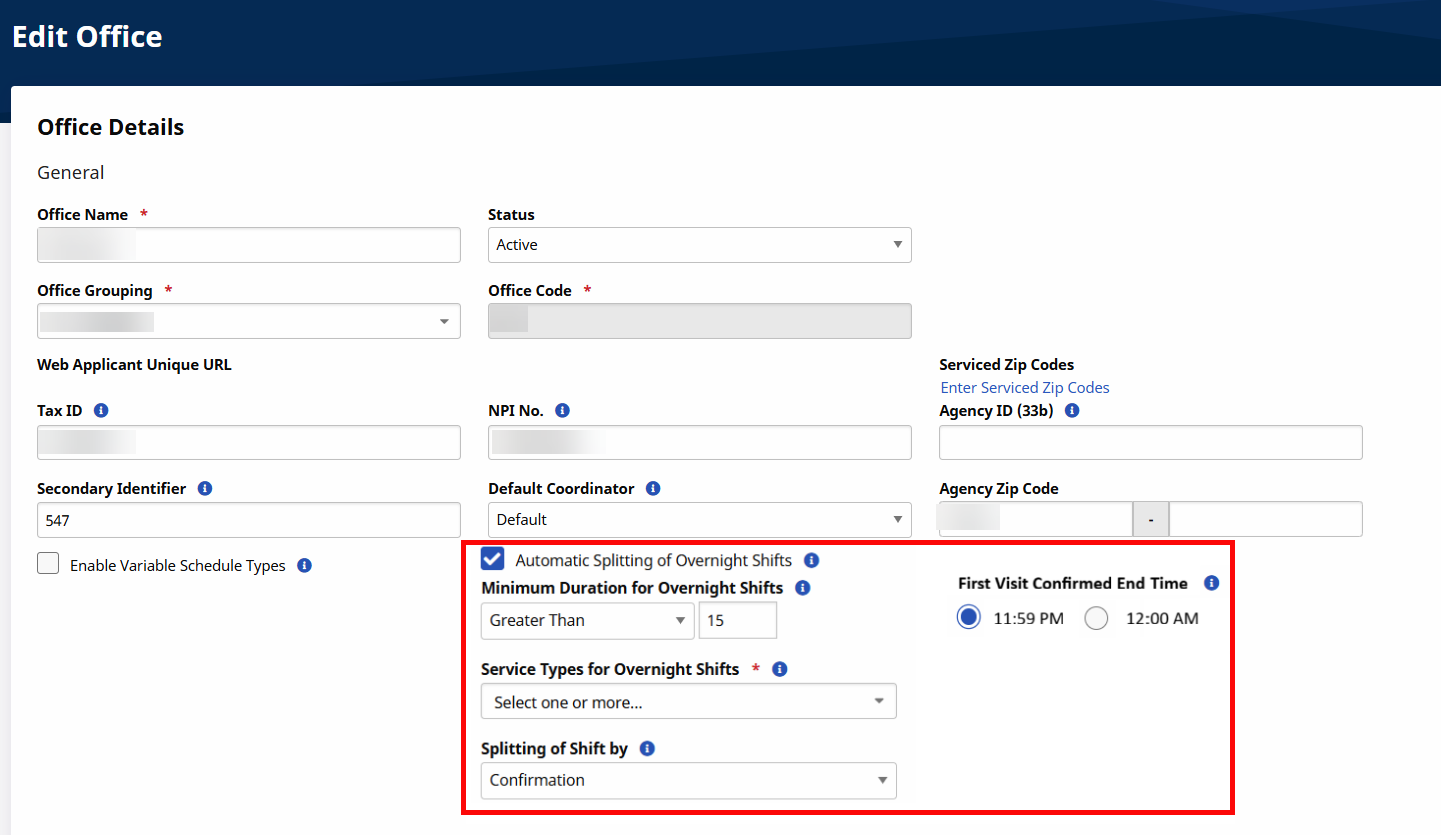 In the Edit Office page under Admin > Office Setup, when the field Automatic Splitting of Overnight Shifts is enabled, the Service Types for Overnight Shifts field displays to indicate the service type(s) to be considered for automatic splitting of overnight shifts. The options are Daily, Hourly, or Visit service type(s).