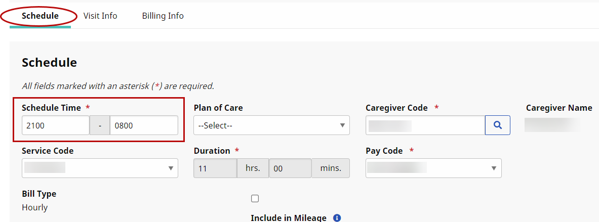 Once Automatic Splitting is enabled, schedule a visit with the intended Start Time and End Time, for the entire shift with no break between days. For example, a visit is scheduled from 9:00 PM to 8:00 AM.