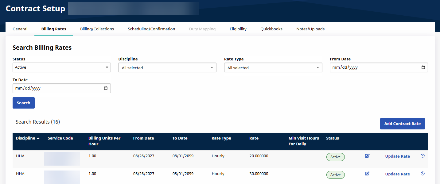 The Billing Rates tab on the Contract Setup page is used to create, review, and search for Billing Rates associated with a Contract.