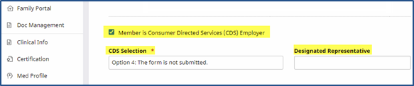 If the Patient is a CDS Employer, select the applicable CDS Selection option using the dropdown. Enter the name of the Designated Representative for the Patient.