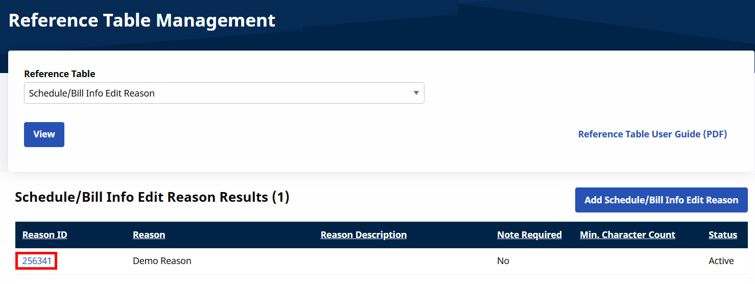 To edit existing values, select the Reason ID link.