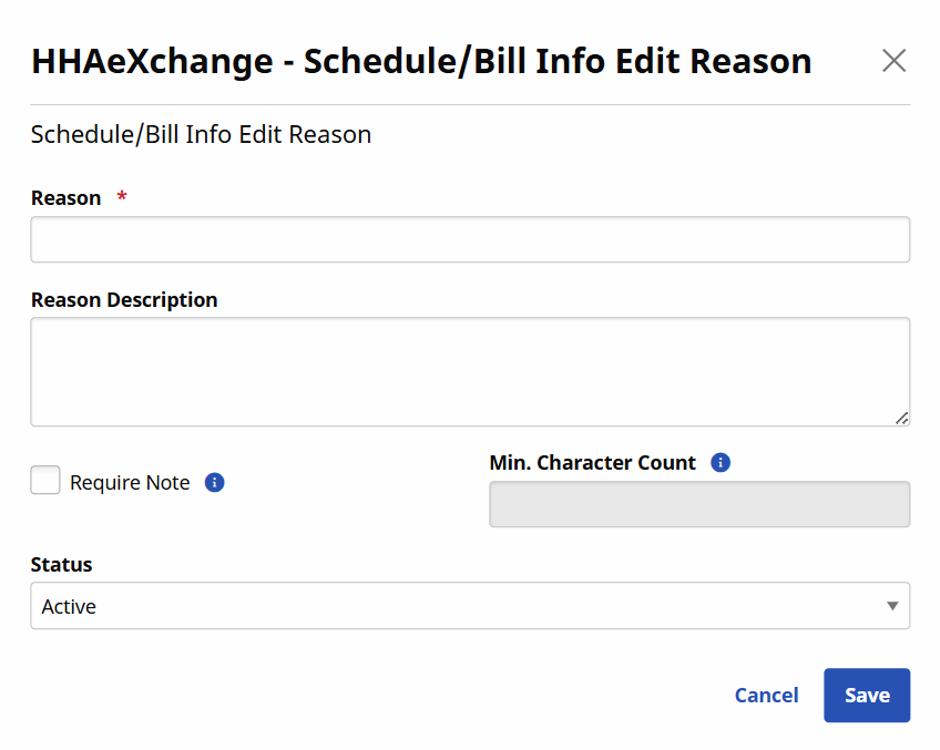 The Schedule/Bill Info Edit Reason window opens. Complete the necessary fields.