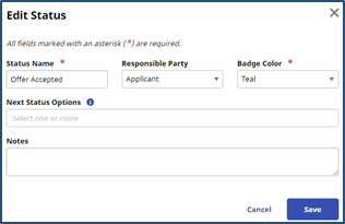 The Edit Status window opens. Enter or select values for the required fields (denoted with red asterisks) to define the status.