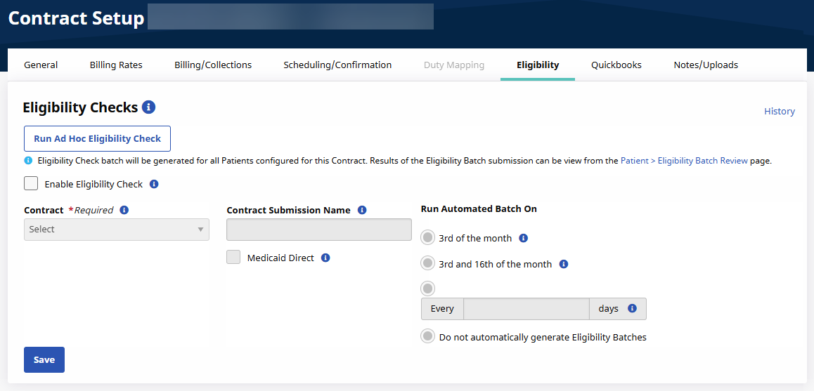 Click the Run Ad Hoc Eligibility Check button to generate an Eligibility Check batch for all Patient’s configured for this Contract.