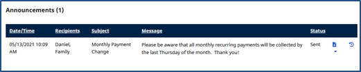 The Announcements section houses communications sent by the Agency on a global level (to all Family Portals) or to individual portals. Each line item indicates the Date/Time of the message, the Recipients (Click the link to view specifics), the Subject of the message, the actual Message, and the Status. The attachment (paperclip) icon indicates if an attachment is available (if green in color). Click the H link to view any message history.