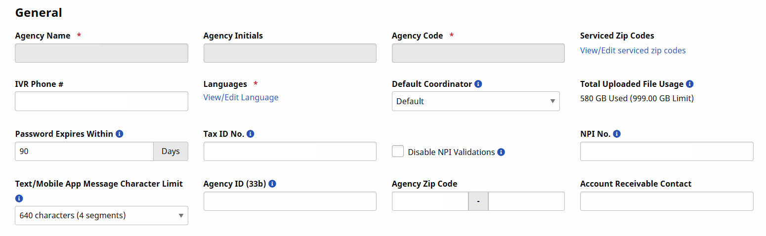 The General section of the Agency Info page is used to capture and set basic Agency information and requirements. It can be found under Admin > Agency Info.