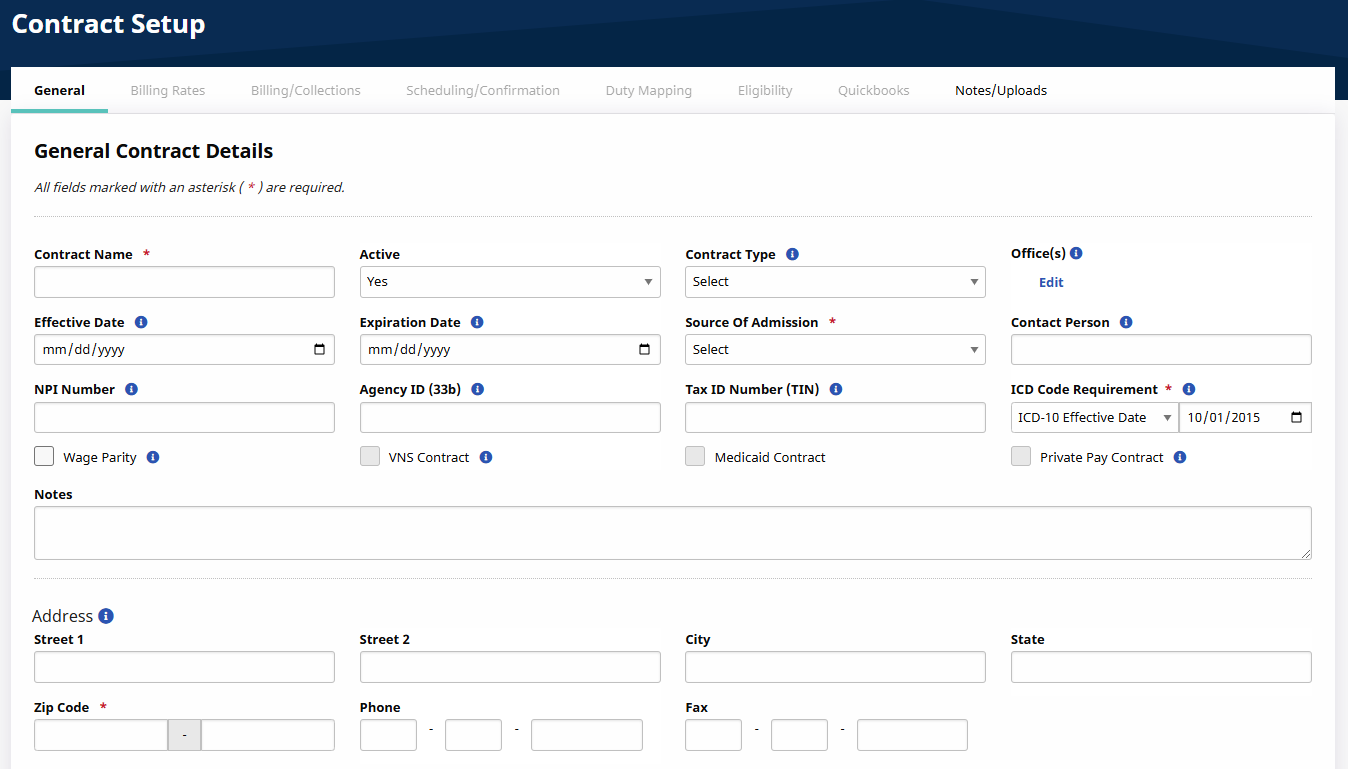 The General tab of the Contract Setup page is used to capture basic Contract Details as well as the Payer’s Address. It can be found under Admin > Contract Setup.