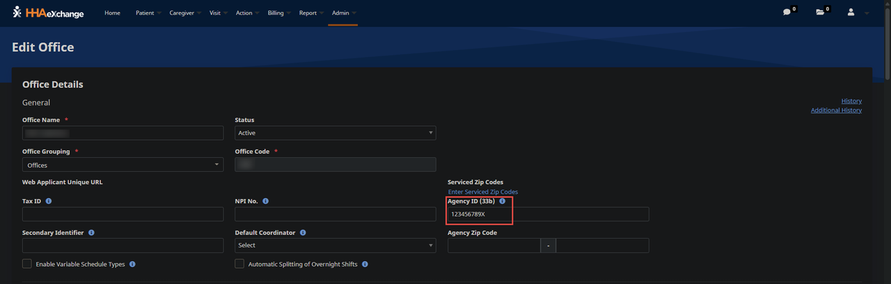 Enter the appropriate NPI, MPI, and TIN for each Contract or Office in the NPI No, Agency ID (33b), and Tax ID No fields. Refer to the following topics for steps on how to add the ProviderIdentifiers to a Contract or Office: