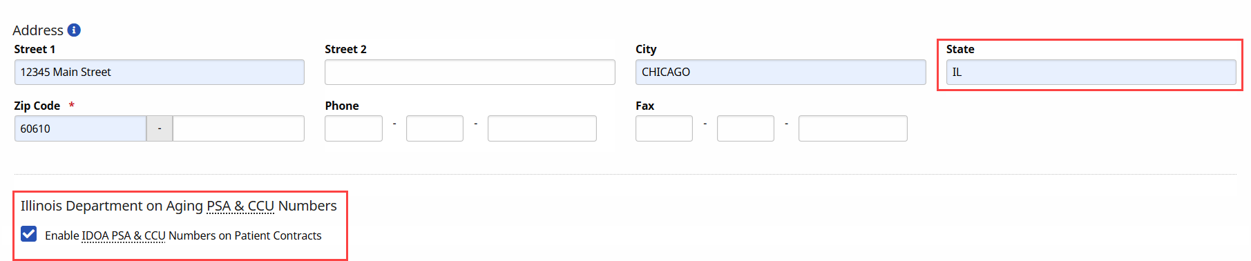 In the Address section, entering an IL Zip Code automatically populates the State field with IL. The IDOA PSA & CCU Numbers field appears below. Select the checkbox to enable this feature.