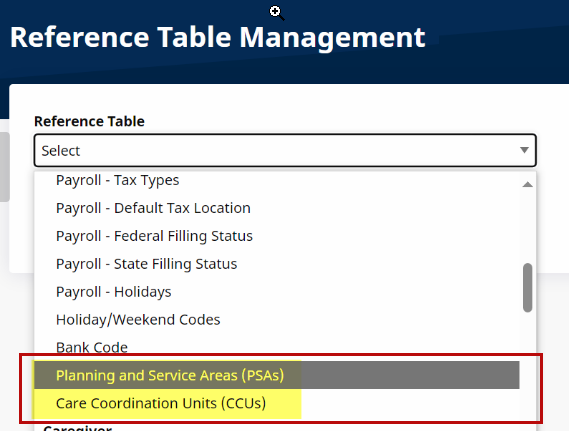 PSA and CCU Number values are created via the Reference Table Management feature under Admin > Referent Table Management. PSA Number values are created and managed in the Planning and Service Areas (PSAs) table, and CCU Number values are created and managed in the Care Coordination Units (CCUs) table.