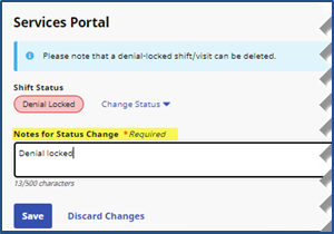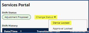 The saved Shift Status displays in the Verification tab as Denial Locked.