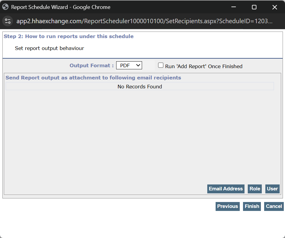Email Address sends the report to selected email addresses - Enter the Email Address in the Email Address field, and then select Add.