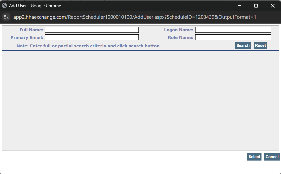 User sends the report to selected users - Enter information in the fields, and then select Search. Select the correct user, and then select Select. The User is added to the report.