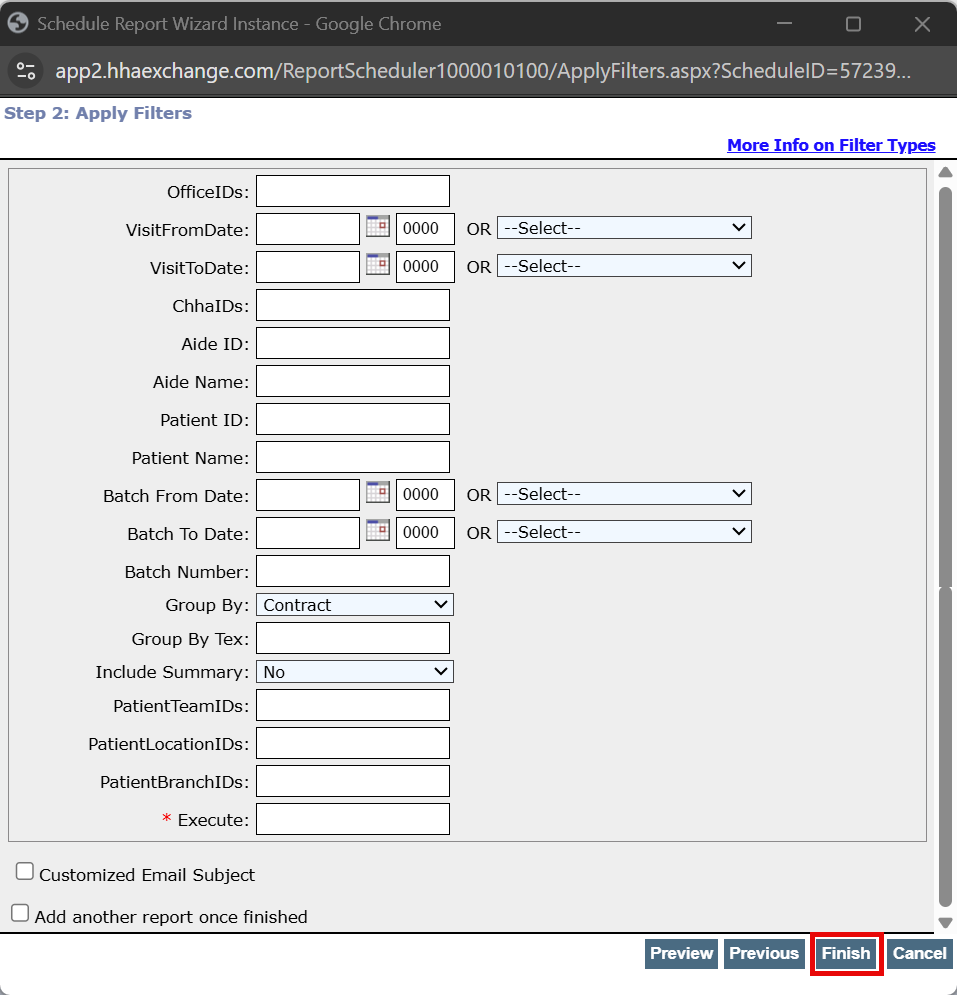 Select delivery options, including email or download from HHAeXchange.