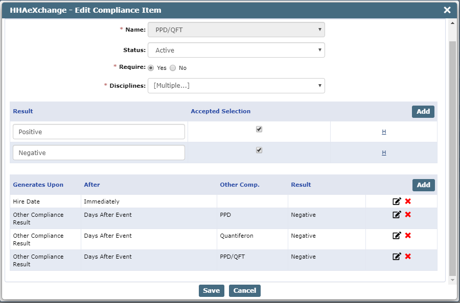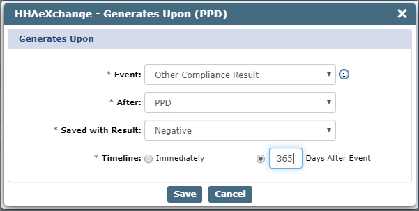 Back on the Edit Compliance Item window, remove the existing Generate Upon condition for the PPD and QuantiFERON Medicals by selecting the red X in the Generate Upon table.