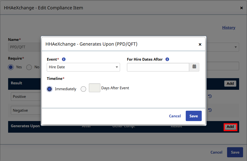 After clicking Save, click on the name of the Compliance Item, and then click the Add button in the Generates Upon section to set up conditions for the Medical (which the system automatically applies once saved). The following Generates Upon conditions are recommended: