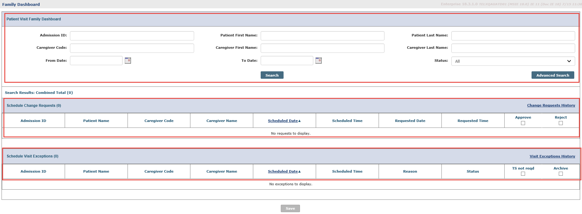The Family Dashboard page is comprised of three sections: Search Filters, Schedule Change Requests, and Schedule Visit Exceptions. Use the available search filters (such as Patient Name, Caregiver Name, or Date range) to locate a specific set of results or click Search to generate a general search.