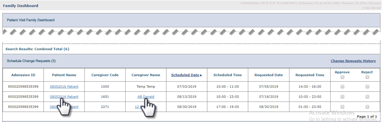 The Schedule Change Requests appear on the top grid displaying details per record to include Admission ID, Patient Name link, Caregiver Code, Caregiver Name link, Scheduled Date/Time, Requested Date/Time, and a Approve and Reject checkboxes.
