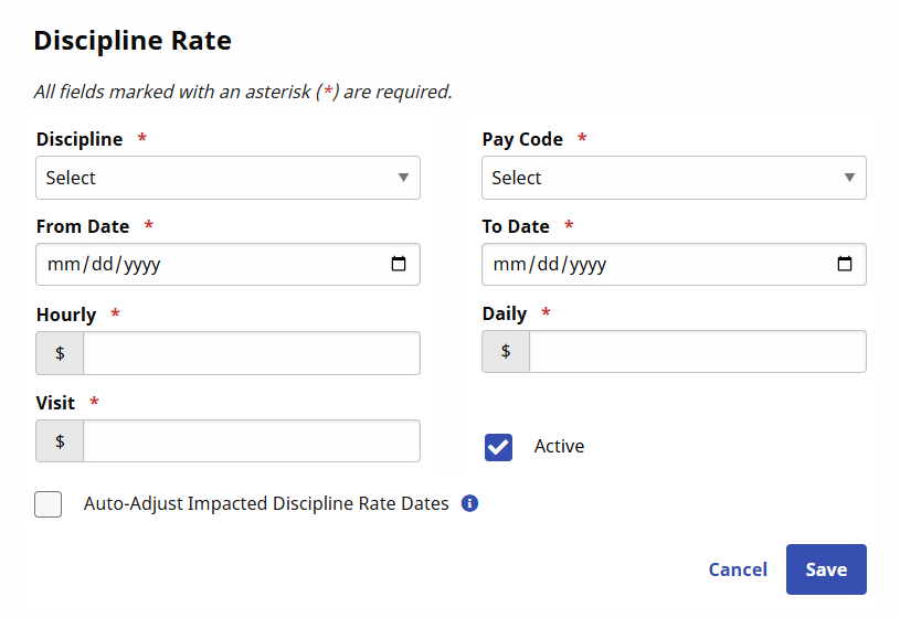 The Discipline Rates window opens. Complete the required fields (denoted with red asterisk) to include Discipline, PayCode, From/To Date, Hourly, Daily, and Visit. Click Save.