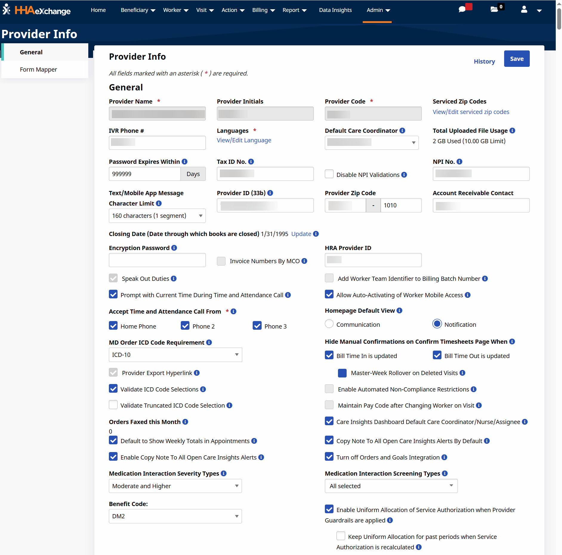 Many HHAeXchange portal features are enabled under Admin > Provider Profile> General. See the table below for more information.