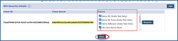 The Client ID and a new system-generated Client Secret code appears on the screen along with the Agency’s associated Payers . Ensure to copy and save the Client Secret code for future use (required to perform EVV API). Next, select the Payers applicable to the new set of credentials. Click Save.