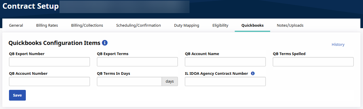 Use the QuickBooks tab of the Contract Setup page to enter and manage the information to export to QuickBooks. The fields represent identifier information required when exporting Contract information for use in QuickBooks.