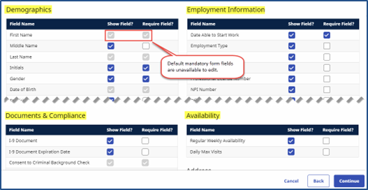 In the Employment Requirements tab, select and configure employment requirement fields which may focus on specific qualifications for employment as a Caregiver (for example, a 3-Month Assessment).