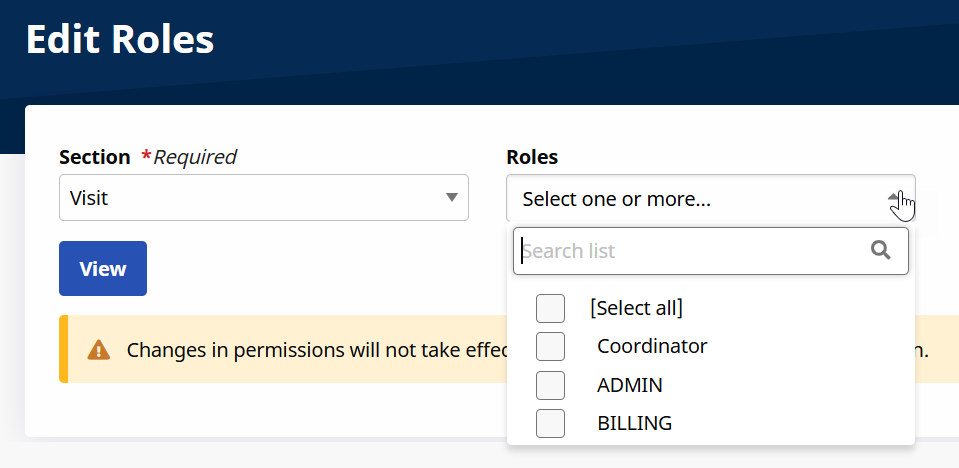 Select Visit from the Section dropdown, the applicable roles from the Roles dropdown field, and then select View.