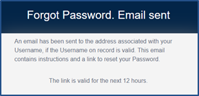 The system issues an alert announcing that an email has been sent to the user. This email contains instructions and a link for the user to reset their password. This link is valid for 12 hours from the time sent.
